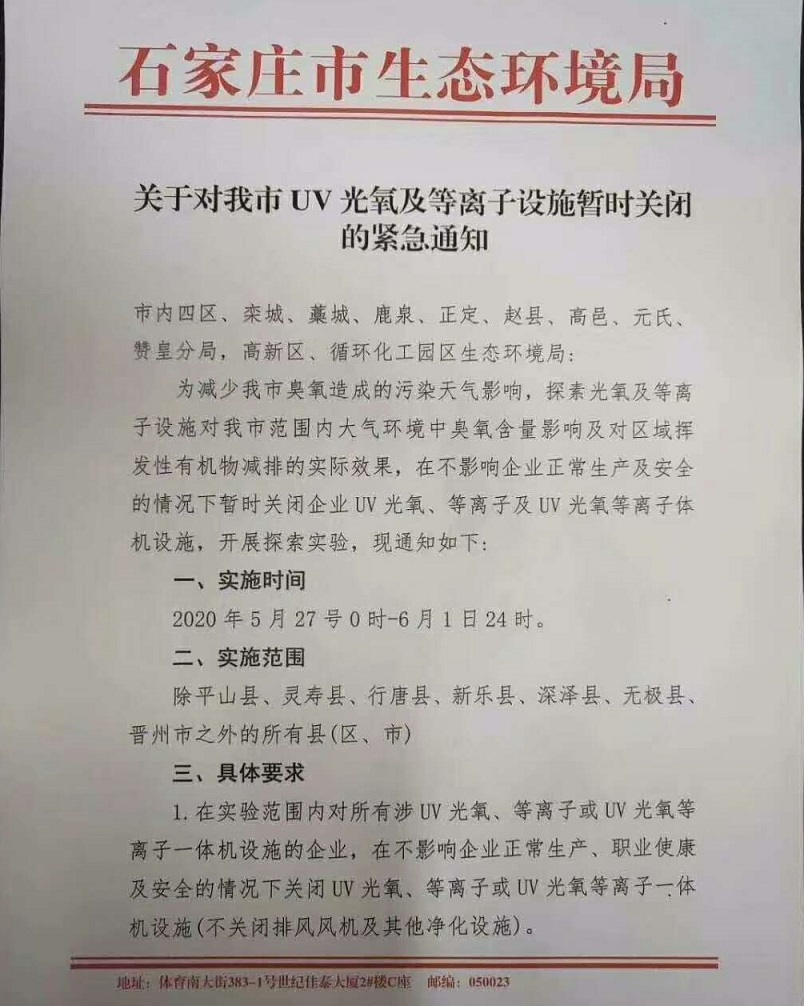 近日,一份河北石家莊市生態(tài)環(huán)境局的文件引起了廣泛流傳,主要內(nèi)容為:為探索光氧及等離子VOCs治理設(shè)施對(duì)石家莊大氣環(huán)境中臭氧含量影響就對(duì)應(yīng)區(qū)域VOCs減排實(shí)際效果,在不影響企業(yè)正常生產(chǎn)及安全的情況下暫時(shí)關(guān)閉企業(yè)UV光氧、等離子及UV光氧等離子體機(jī)設(shè)施(但不關(guān)閉排風(fēng)風(fēng)機(jī)及其它凈化措施),開展探索實(shí)驗(yàn)。實(shí)施時(shí)間為:5月27日0時(shí)到6月1日24時(shí)!