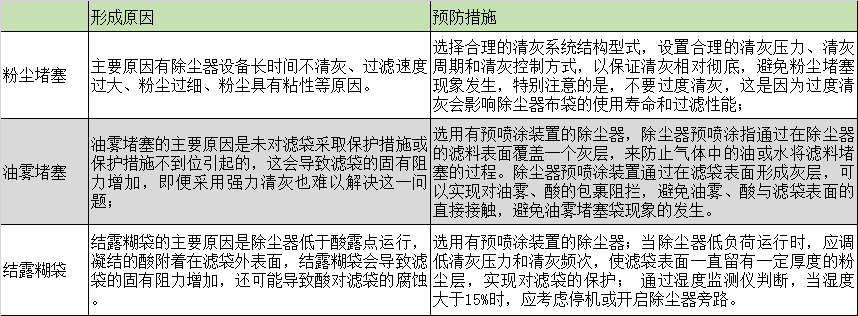 堵塞失效主要包括粉塵堵塞、油霧堵塞、結(jié)露糊袋三種類(lèi)型。