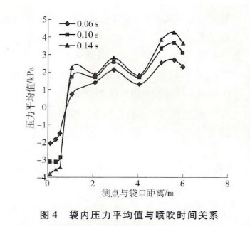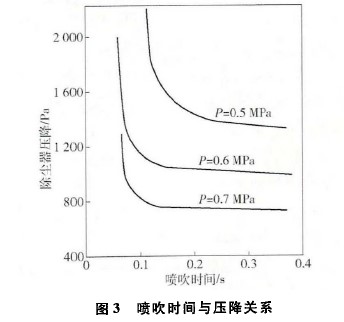 脈沖除塵器脈沖閥的噴吹時間越長,布袋除塵器的清灰效果也會越明顯。同時,脈沖閥噴入布袋內(nèi)部的壓縮空氣的風量也會越多。但是除塵器的噴吹時間如果增加到一定值后由于除塵集風箱內(nèi)風量等的原因,除塵器清灰效果的提升就會變得不再明顯。一般情況下,布袋式除塵器脈沖閥的噴吹時間設定在0.1~0.2s之間。噴吹時間對布袋內(nèi)壓力平均值的影響如圖所示。