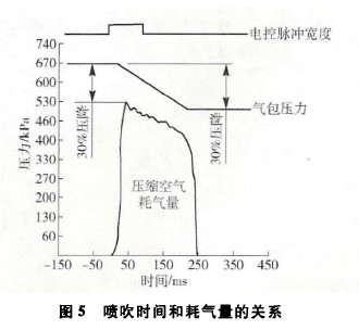 壓縮空氣消耗量主要限制的因素比較多,但主要包括噴吹壓力、噴吹周期、噴吹時間、結(jié)構(gòu)類型及通經(jīng)等因素。圖5為噴吹壓力條件下噴吹時間和脈沖閥耗氣量的關系。