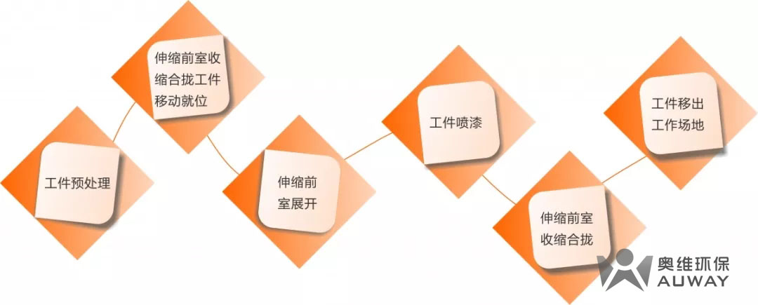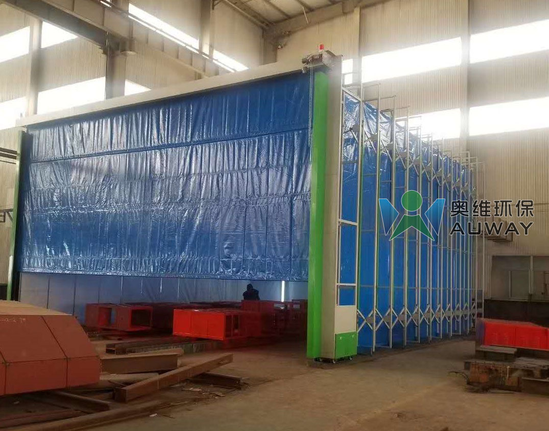 移動(dòng)式噴漆伸縮房是配合除塵設(shè)備和廢氣處理設(shè)備使用的一種大型環(huán)保設(shè)備。主要用于體積大、重量重的工件的噴漆和打磨。伸縮房收攏時(shí),將產(chǎn)品用行車移動(dòng)至伸縮房伸縮范圍的適當(dāng)位置,開走行車,將伸縮房伸展開來,在伸縮房內(nèi)進(jìn)行噴漆作業(yè)。作業(yè)完成后,收攏伸縮房,將噴漆后的產(chǎn)品使用行車挪走。伸縮房的使用,使工作場地的使用更科學(xué)合理。
