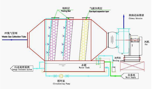 廢氣從塔底進入塔內,氣體從底部通過填料層,然后從塔頂?shù)某隹谂懦?。水從塔的頂部和中間均勻地通過液體分配器噴射到填料層,并沿著填料層的表面流下,直到塔的底部由泵送到塔的頂部和中間以便回收。水汽和剩余的廢氣進入脫水除霧階段,脫去液滴、霧氣。經過初始處理后的氣體從吸收塔的上端排氣管進入下一級處理階段或排出大氣。