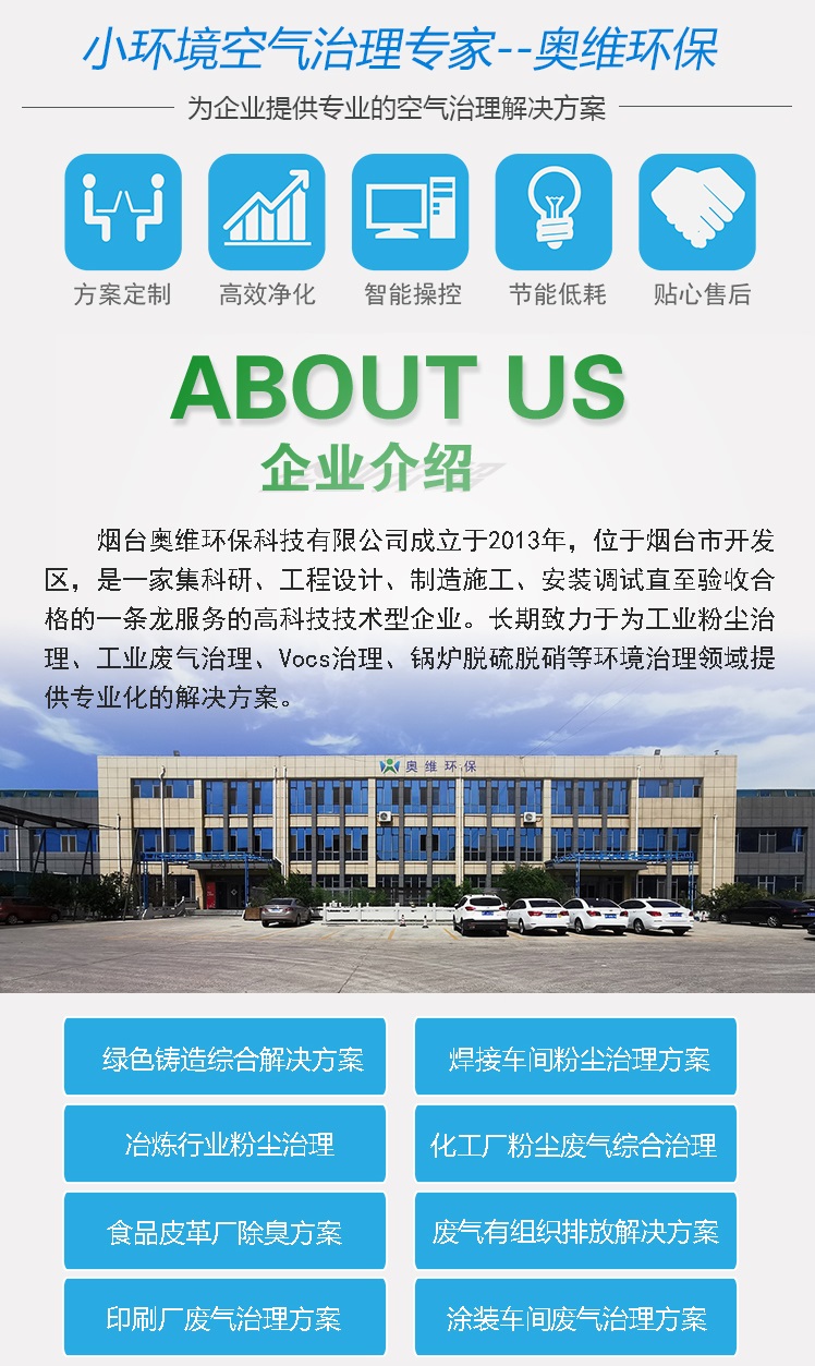 - 簡(jiǎn)介: 煙臺(tái)奧維環(huán)??萍加邢薰境闪⒂?013年,位于煙臺(tái)市開(kāi)發(fā)區(qū),是一家集科研、工程設(shè)計(jì)、制造施工、安裝調(diào)試直至驗(yàn)收合格的一條龍服務(wù)的高科技技術(shù)型企業(yè)。長(zhǎng)期致力于為工業(yè)粉塵治理、工業(yè)廢氣治理、Vocs治理、鍋爐脫硫脫硝等環(huán)境治理領(lǐng)域提供專(zhuān)業(yè)化的解決方案。